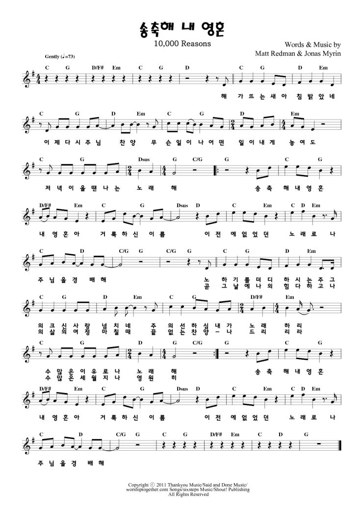 송축해 내 영혼 (10000 Reasons) 악보 - Matt Redman : 네이버 블로그