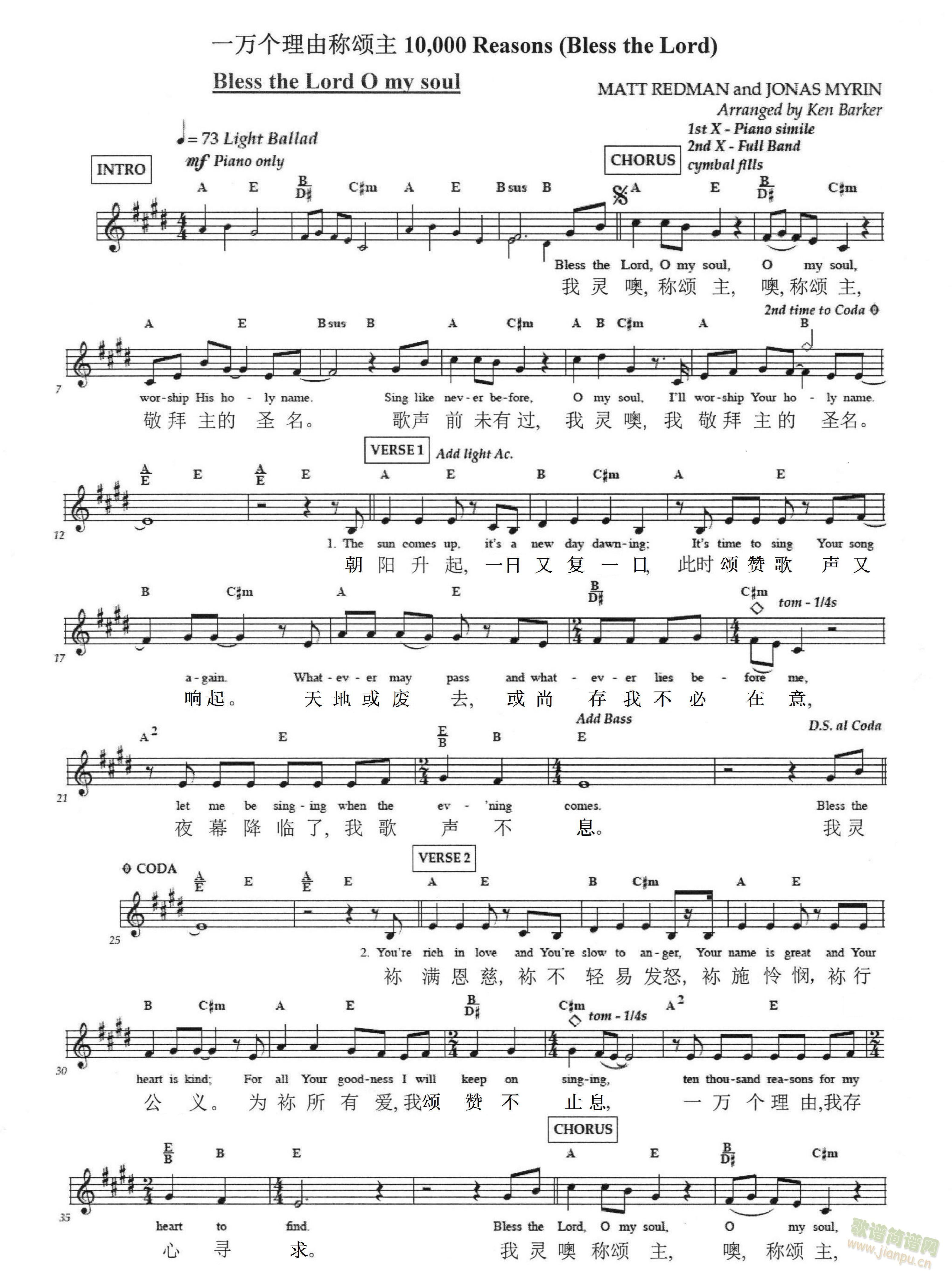 10,000 Reasons (Bless The Lord)(简谱)_歌谱杂录_基督教歌谱大全