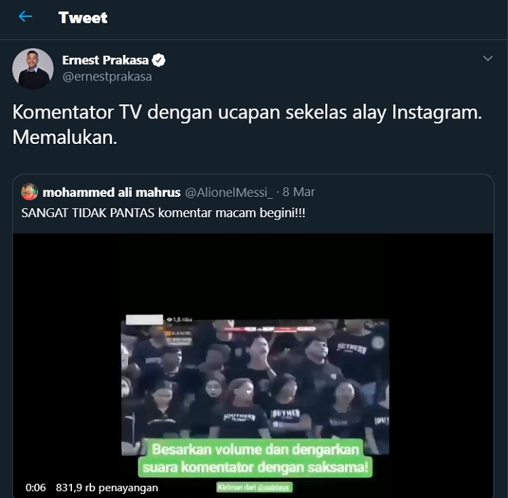 Ernest Prakasa Ikut Sindir Komentator Bola yang Lecehkan Suporter …
