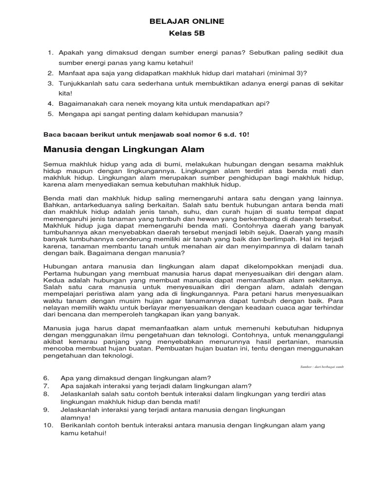 Manusia dengan Lingkungan Alam: Belajar Online Kelas 5B