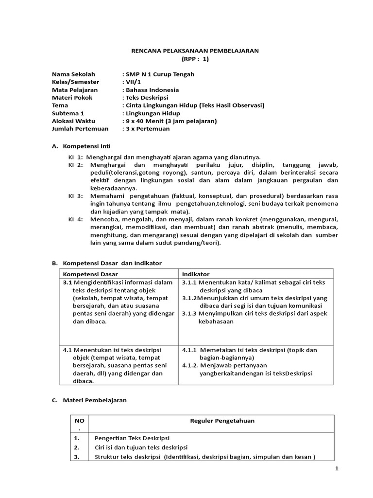 RENCANA PELAKSANAAN PEMBELAJARAN Nama Sekolah : SMP Negeri 3 Wates Kelas/Semester : VII/1 Mata Pelajaran : Bahasa Indonesia