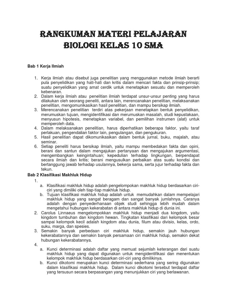 Rangkuman Materi Pelajaran Biologi Kelas 10 SMA: Bab 1 Kerja …