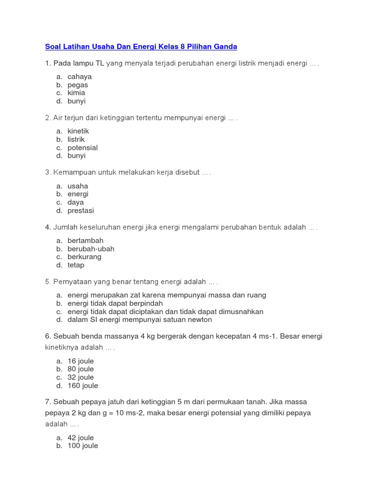 Soal Latihan Usaha Dan Energi Kelas 8 Pilihan Ganda