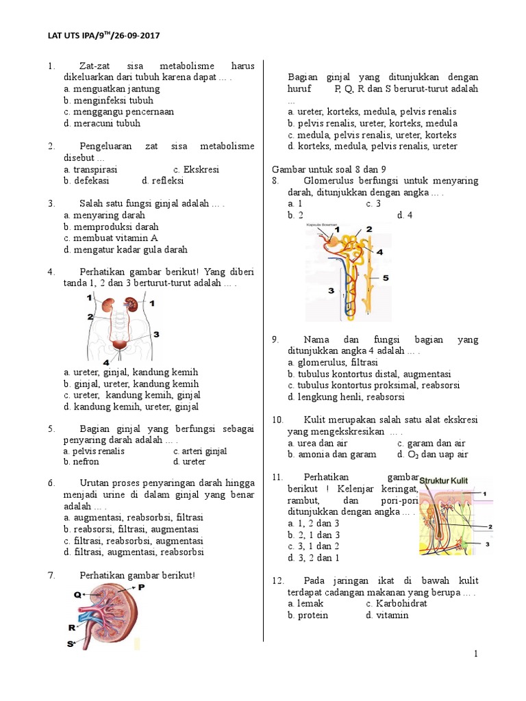 SOAL 1 PRE TEST SISTEM EKSKRESI PADA MANUSIA KELAS XI IPA SMA-MA …