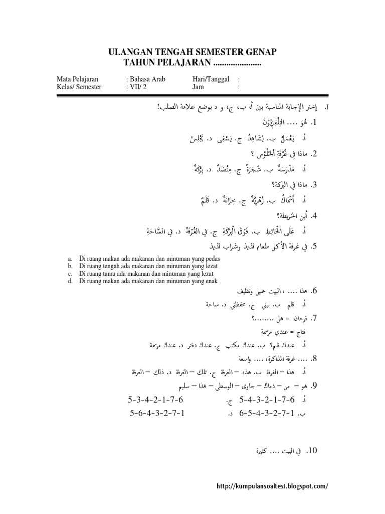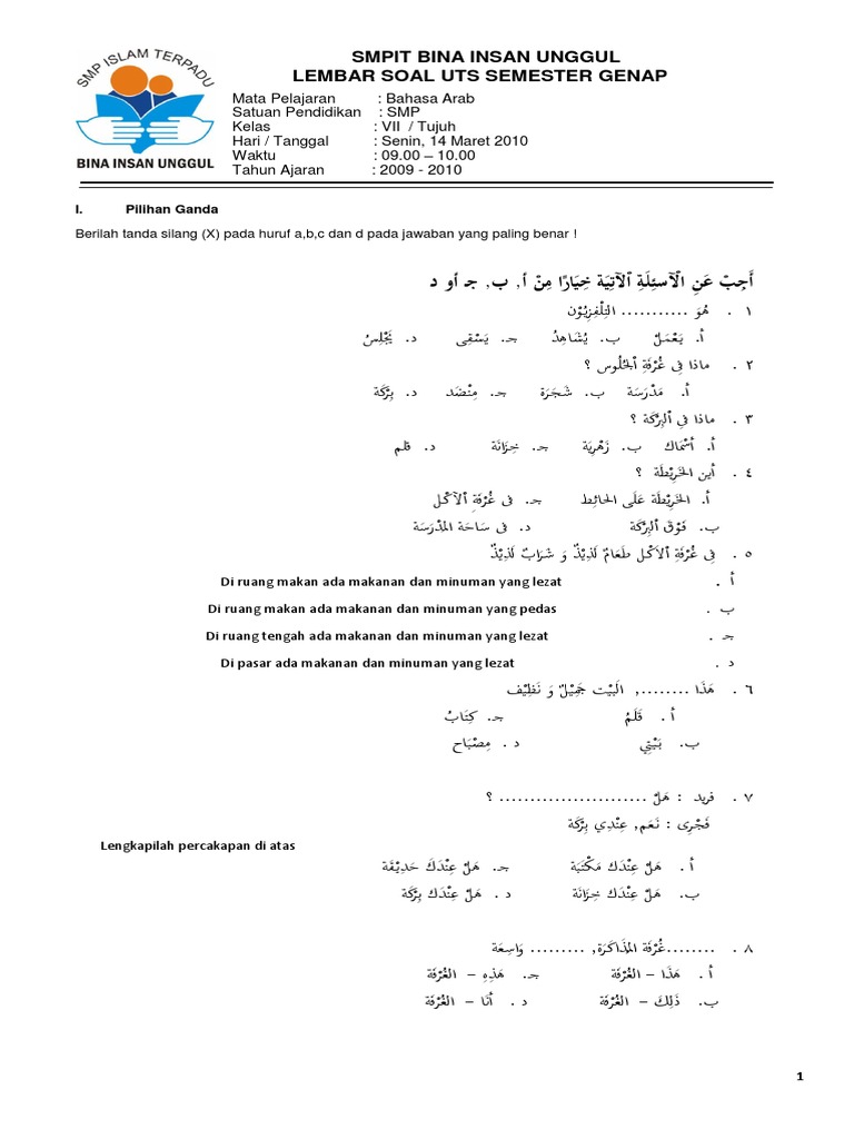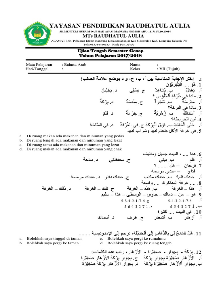 Soal Uts Bahasa Arab Semester 2