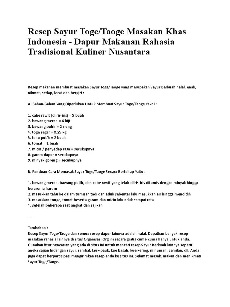 Resep Sayur Toge/Taoge Masakan Khas Indonesia - Dapur …