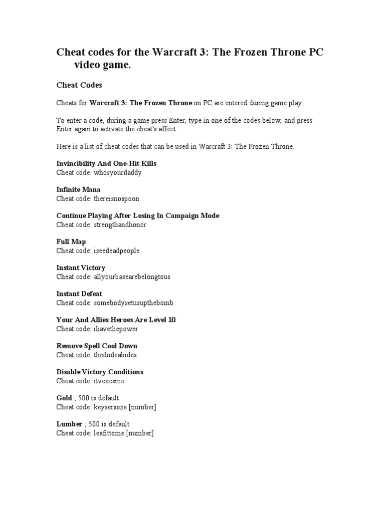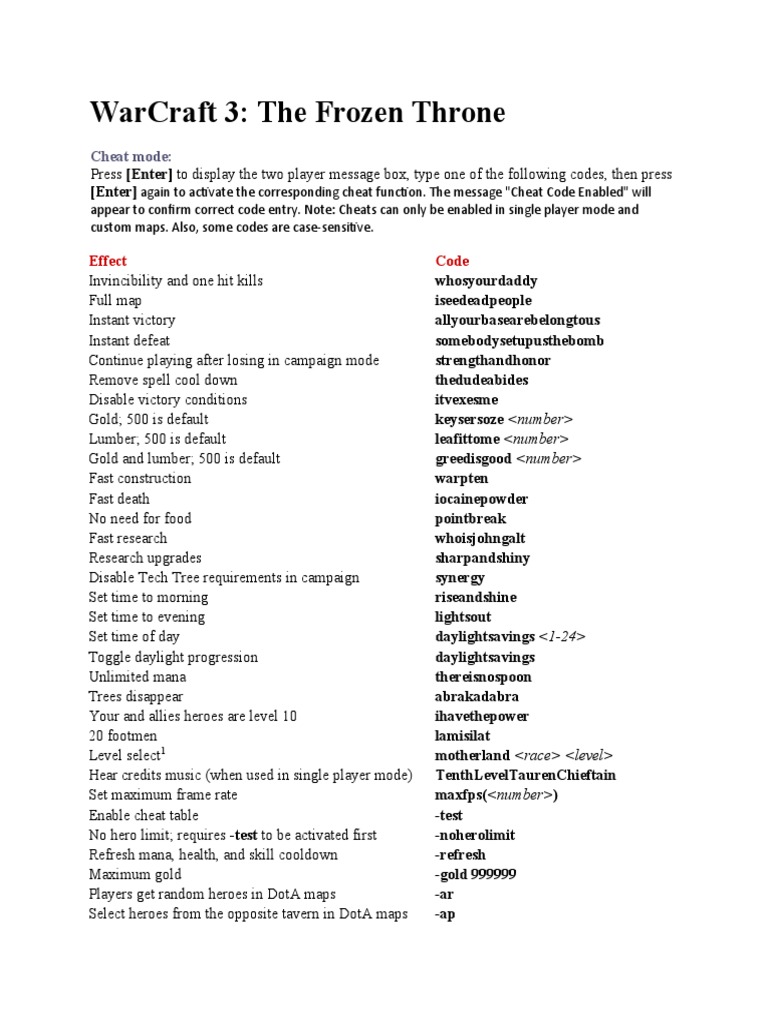 Cheat Codes for Warcraft III: The Frozen Throne