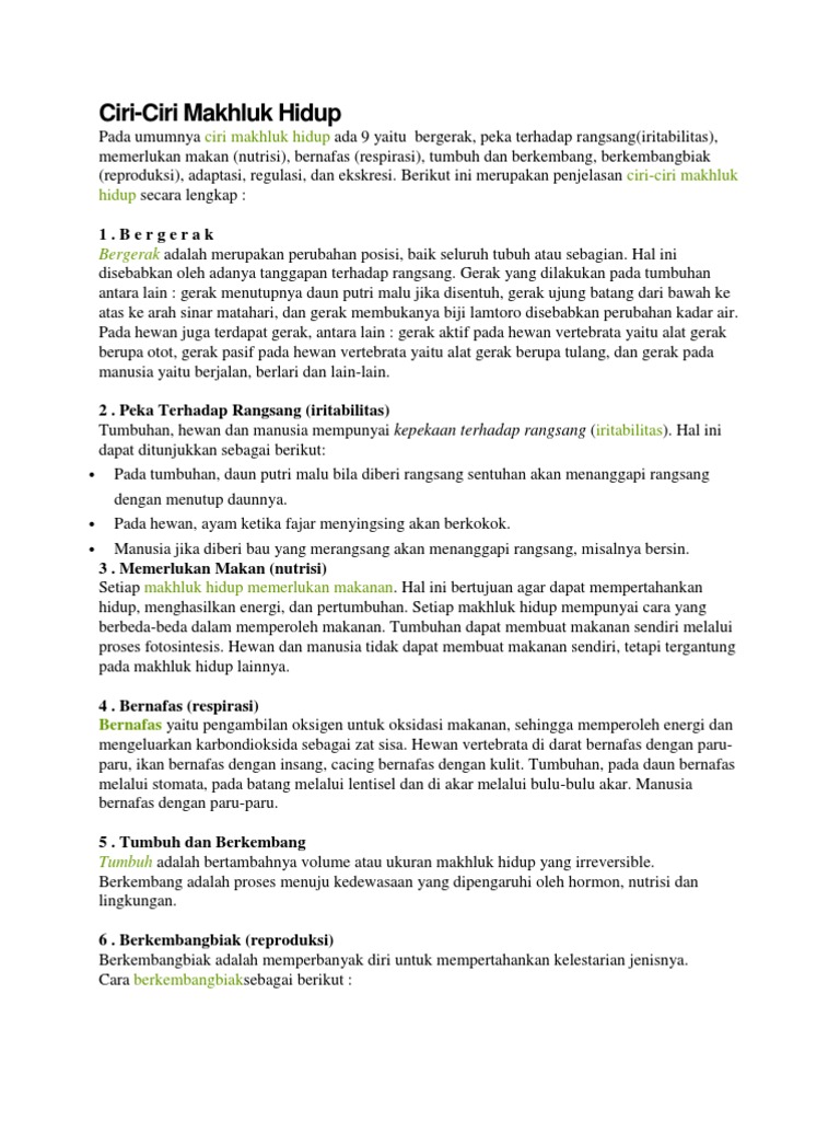 Ciri-Ciri Makhluk Hidup - Manusia, Hewan Dan Tumbuhan - [DOCX Document]