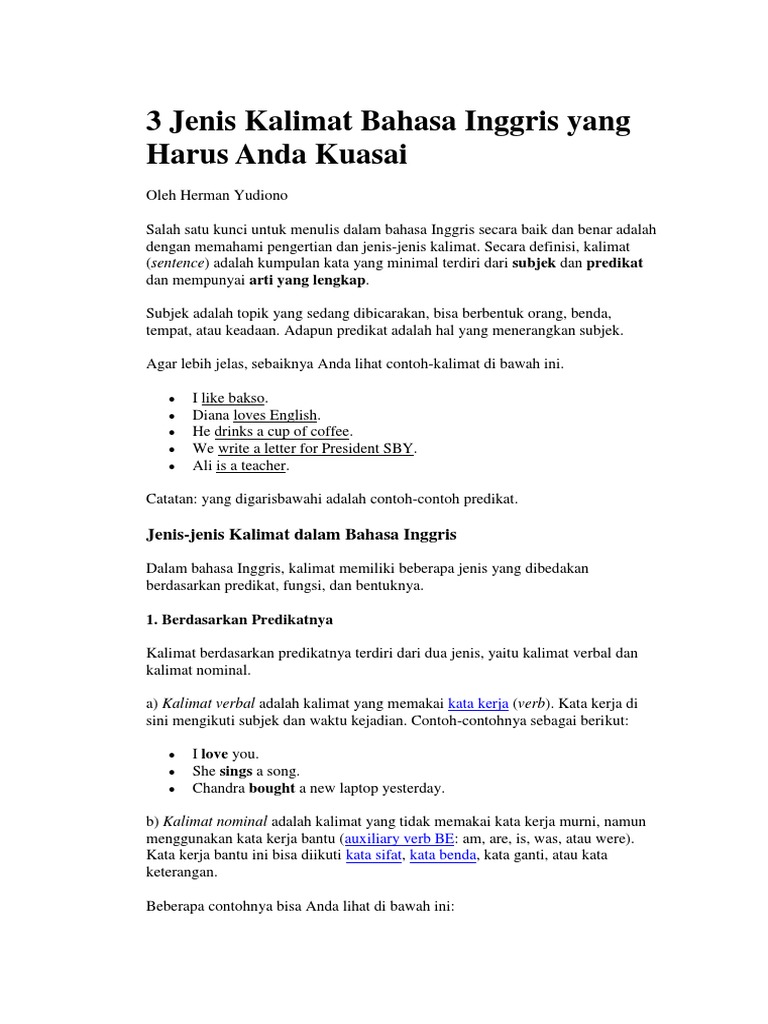 Beberapa Jenis Kalimat berdasarkan Struktur Bahasa Inggris
