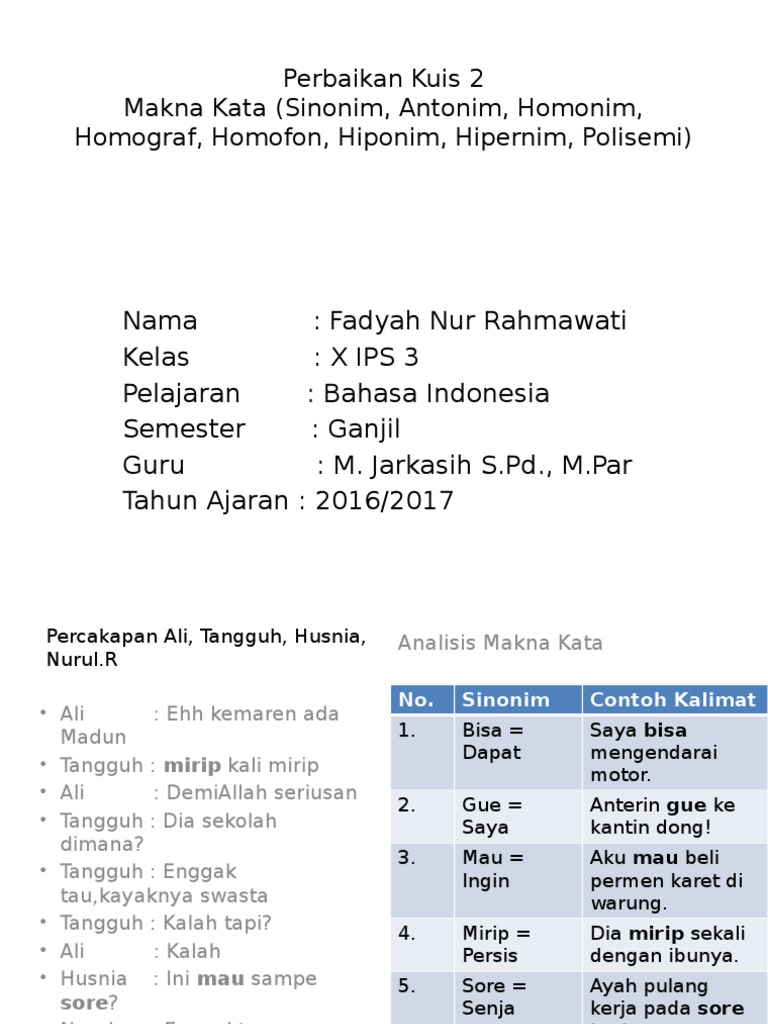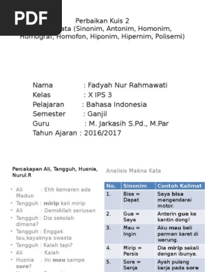 Perbaikan Kuis 2 Makna Kata (Sinonim, Antonim, Homonim, Homograf …