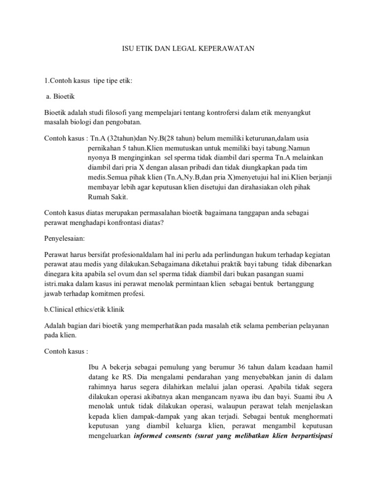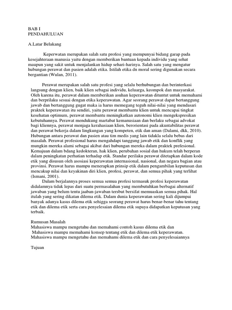 contoh kasus dilema etik BAB I PENDAHULUAN Latar Belakang Keperwatan merupakan salah satu profesi yang mempunyai bidang garap pa