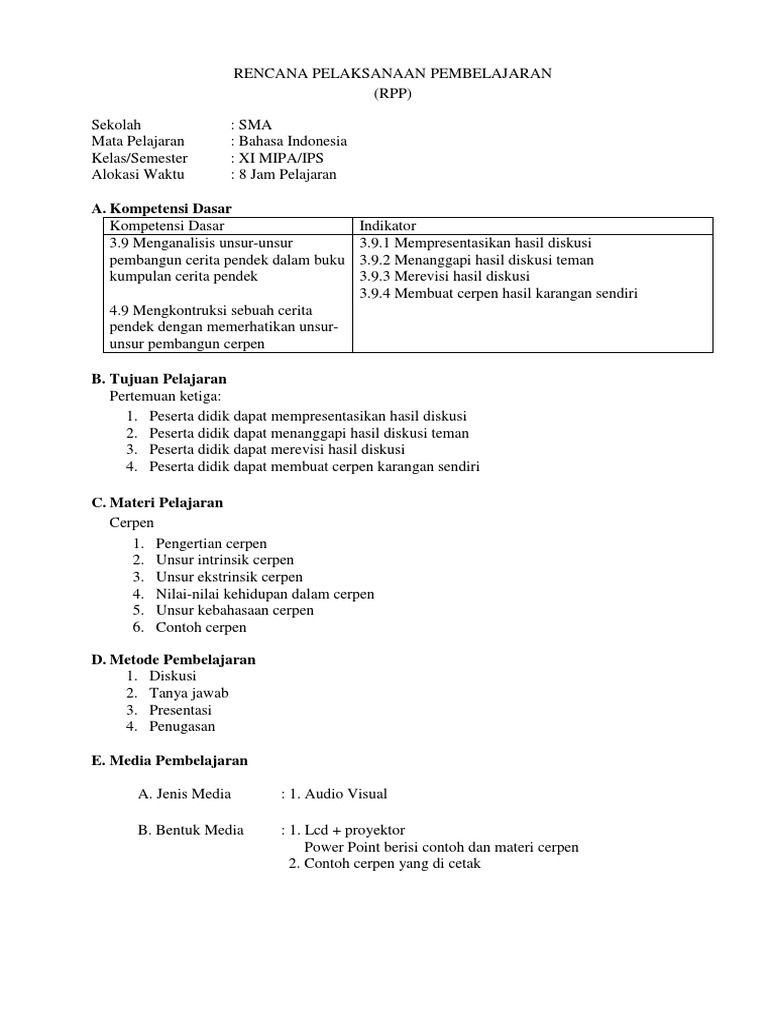DOC) RENCANA PELAKSANAAN PEMBELAJARAN Sekolah : SMK Sehati Karawang Mata Pelajaran : Bahasa Indonesia Kelas/Semester : X1/Ganjil Materi Pokok : Cerita pendek Alokasi Waktu : 4 x 45 Menit (2X pertemuan | Siti Masturoh - Academia.edu