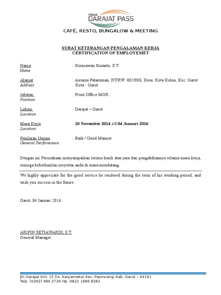 Contoh Surat Pengalaman Kerja Doc