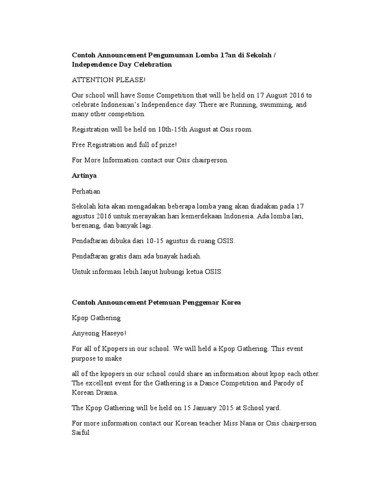Contoh Pengumuman Lomba 17 Agustus Di Sekolah Dalam Bahasa Inggris …