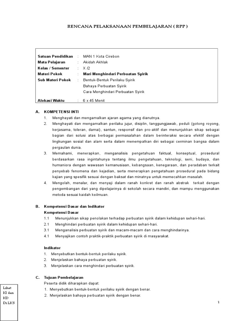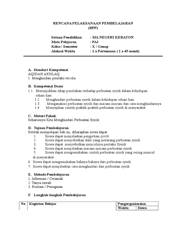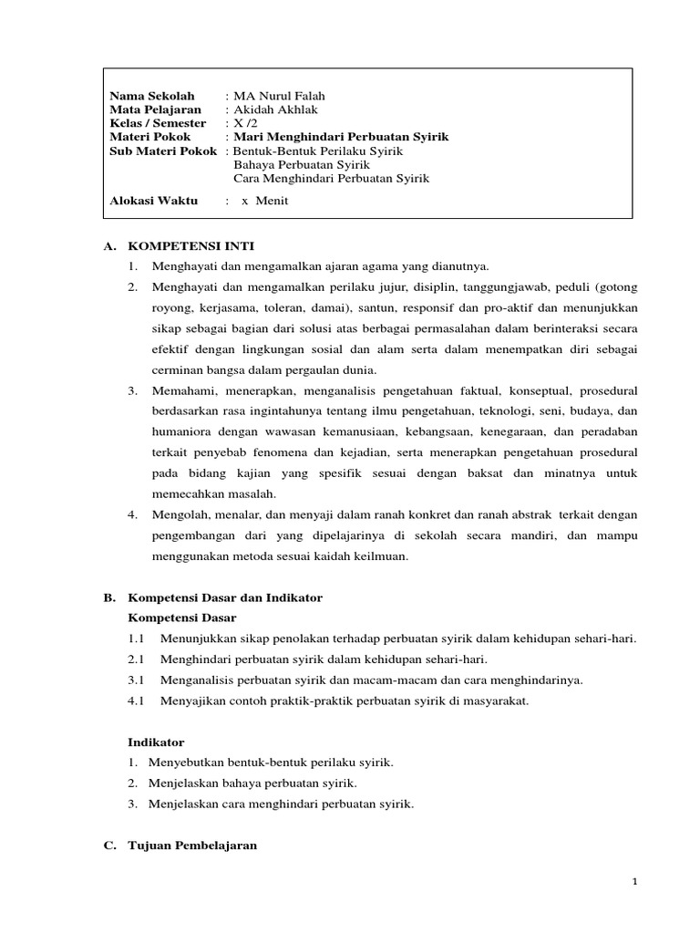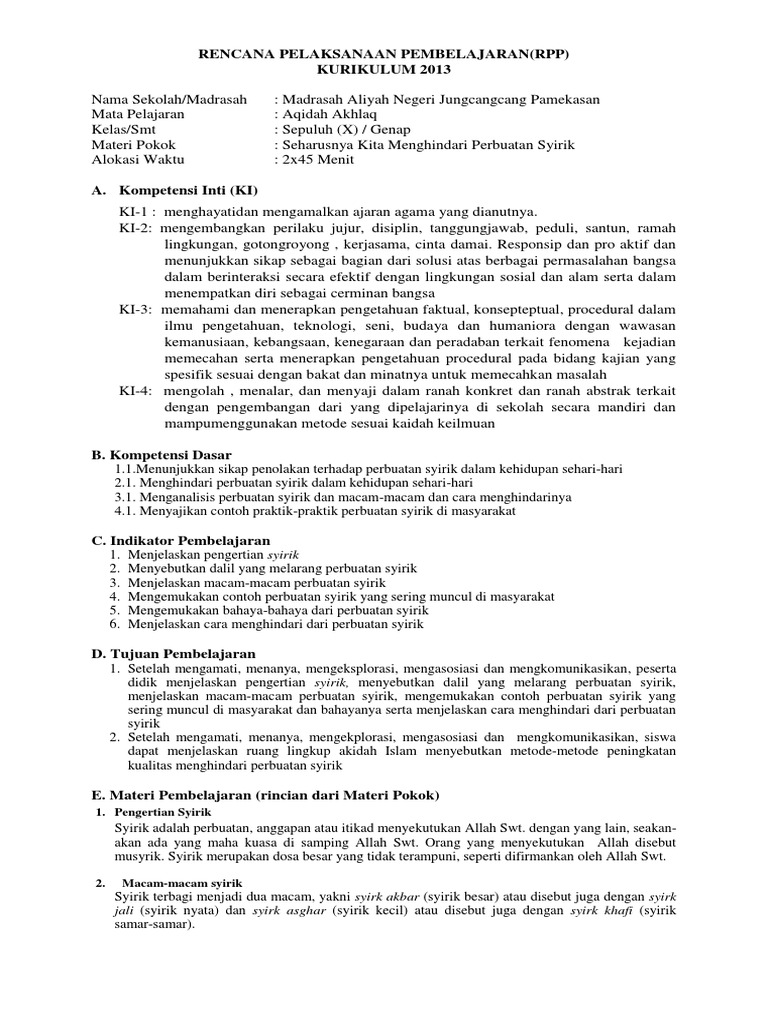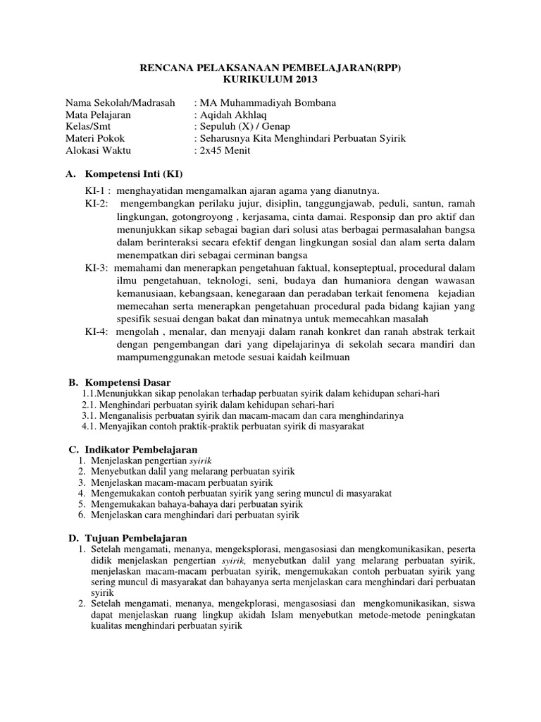 RPP Aqidah Akhlak MA Kelas X Semester 1 2 Kurikulum 2013 Revisi 2016