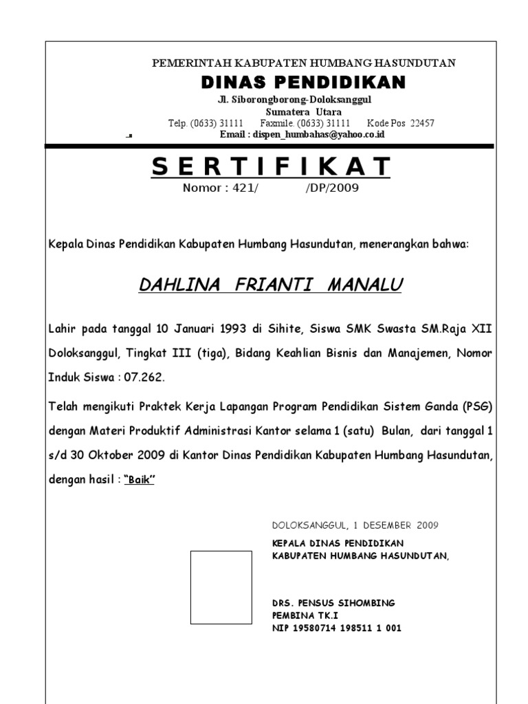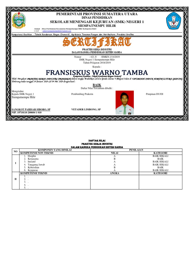 Contoh Sertifikat Pkl Smk
