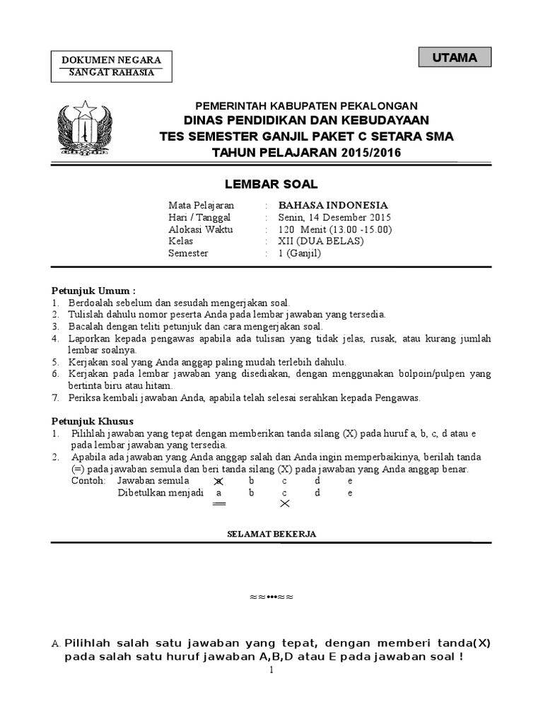 Soal Bahasa Indonesia Kelas XII Semester Gasal