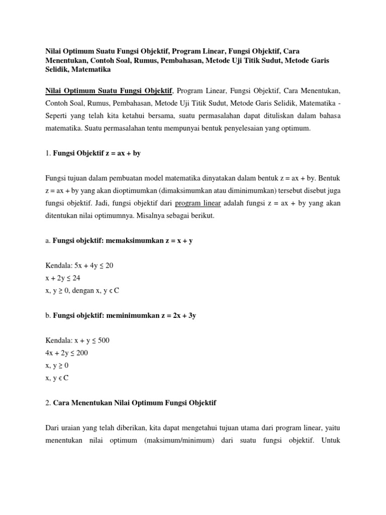 Nilai Optimum Suatu Fungsi Objektif, Program Linear, Fungsi …