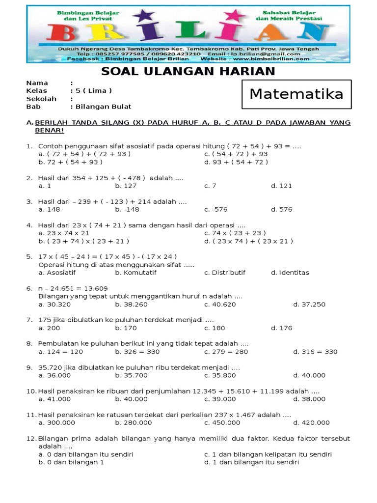 Soal UTS Matematika Kelas 5 SD Semester 1 dan Kunci Jawaban - Bimbel Brilian