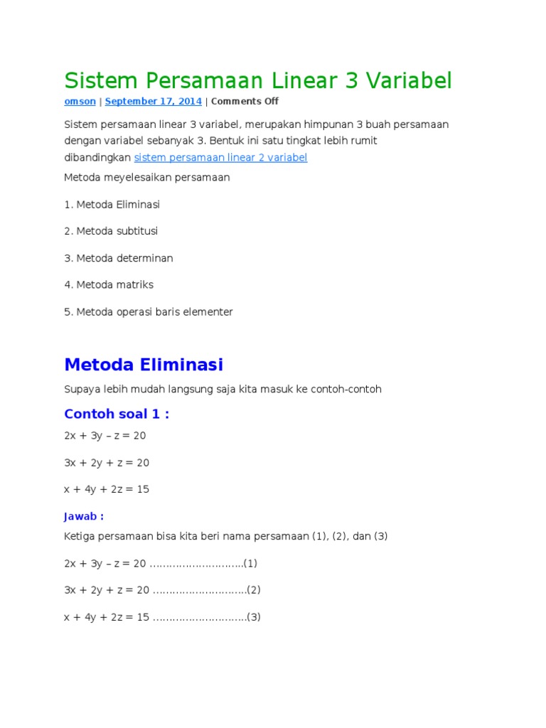Sistem persamaan linear 1 2 3 variabel eliminasi substitusi determinan