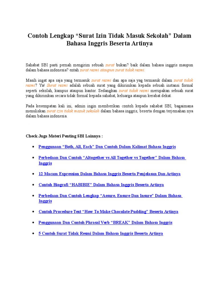 Contoh Surat Izin Tidak Masuk Sekolah Bahasa Inggris Dan Terjemahannya