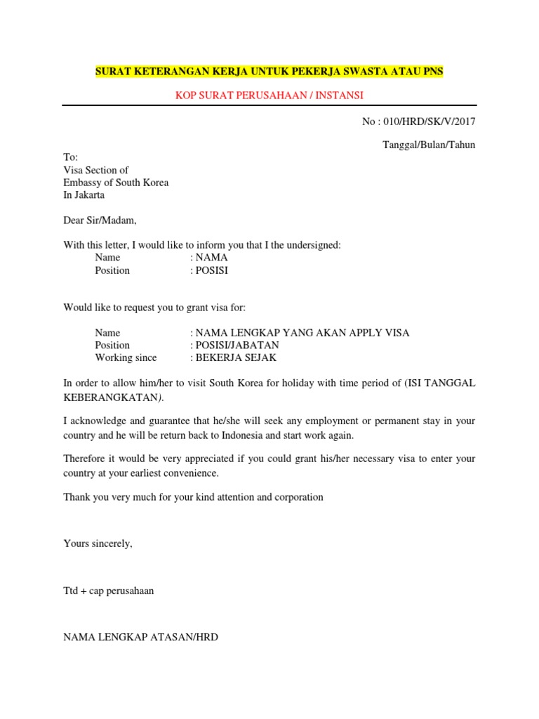 Contoh Surat Keterangan Kerja Bahasa Inggris Untuk Visa Korea - Contoh Seputar Surat