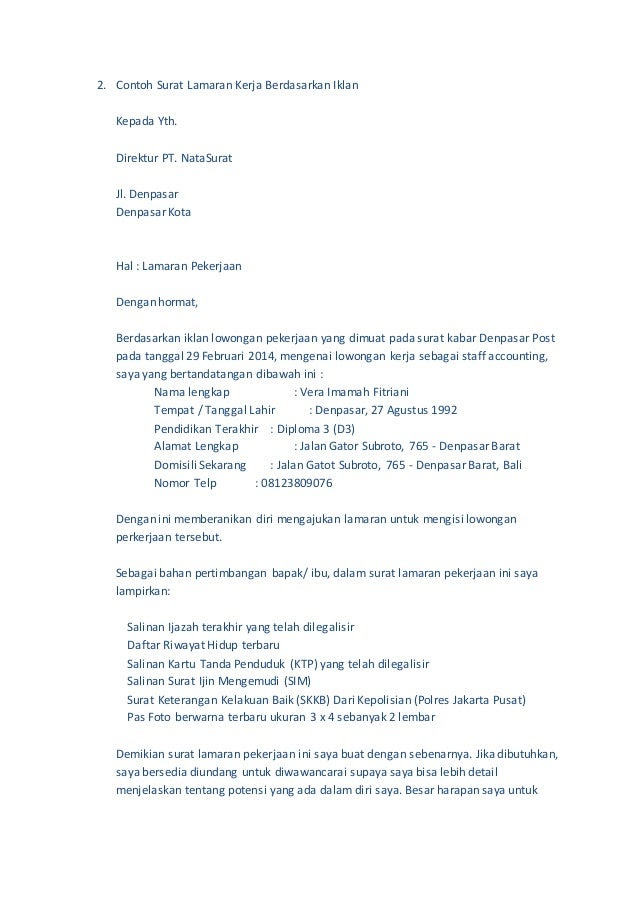 Contoh Surat Lamaran Kerja Berdasarkan Iklan Lowongan Kerja Di …