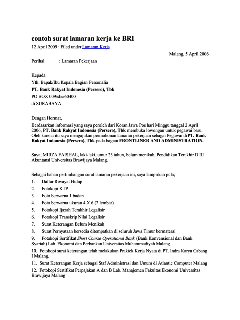 Contoh Surat Lamaran Kerja Bank Bri Malang