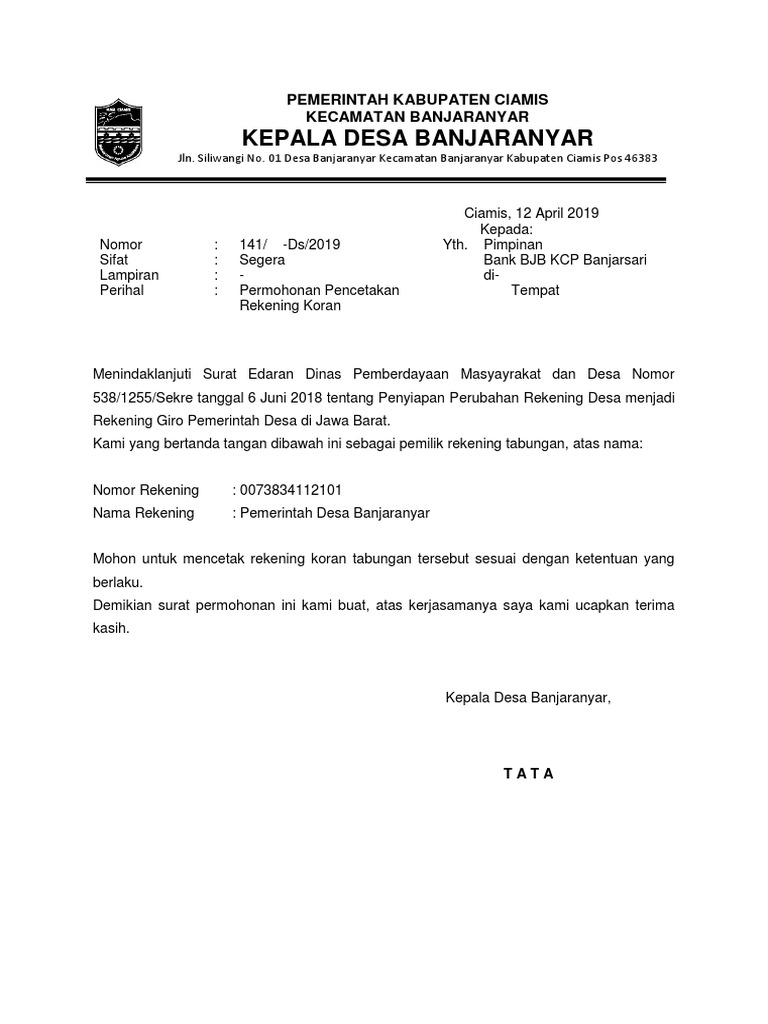 Contoh Surat Permohonan Rekening Koran Desa