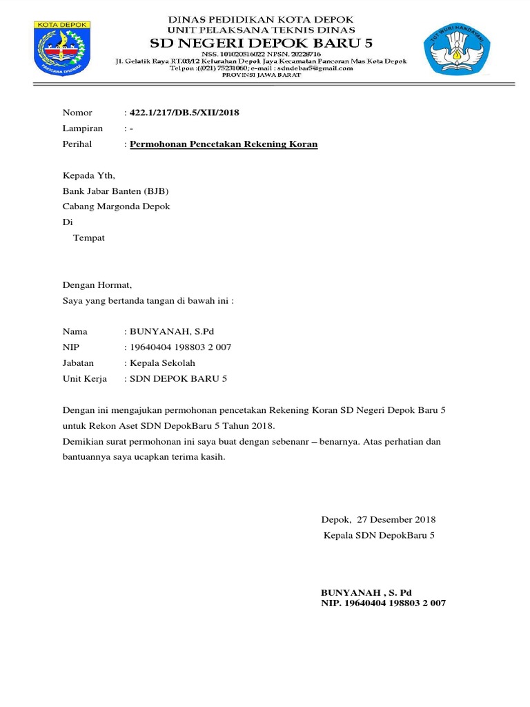 Surat Permohonan Sekolah untuk Cetak Rekening Koran Bank …
