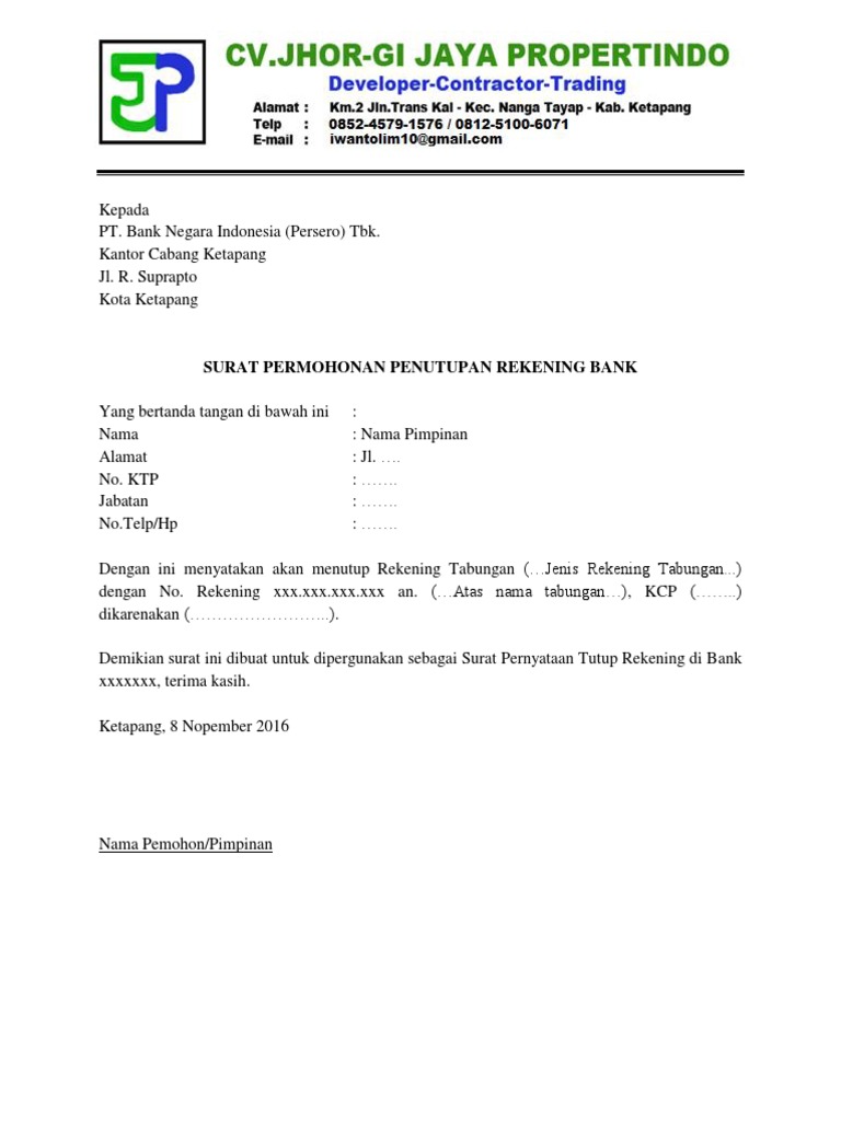 Surat Permohonan Penutupan Rekening Bank Perusahaan - Format Surat