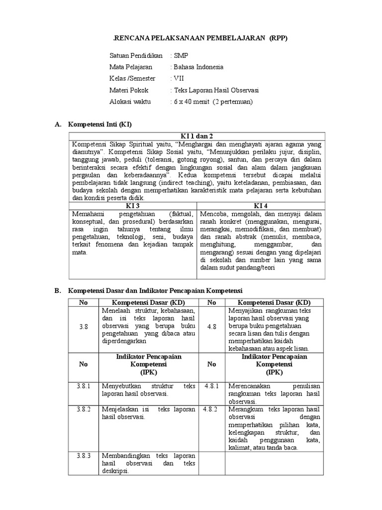 KD 3.1-4.1 Teks Laporan dan Observasi.docx - RENCANA PELAKSANAAN PEMBELAJARAN Nama Sekolah Mata Pelajaran Materi Pokok Komp Keahlian Kelas/Semester | Course Hero