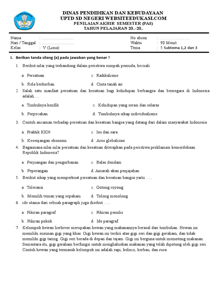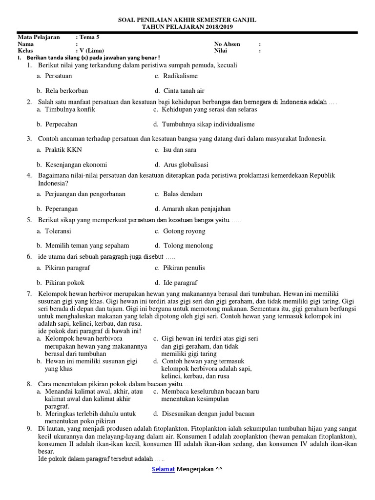 Soal Semester Tema 5 Kelas 5 SD/MI - antapedia.com