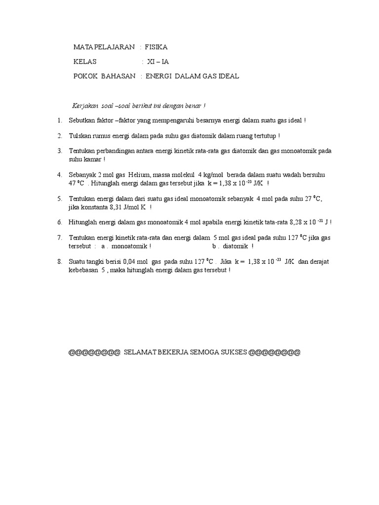 Contoh Soal Cara Cari Energi Dalam Gas Ideal - SUKSESPRIVAT