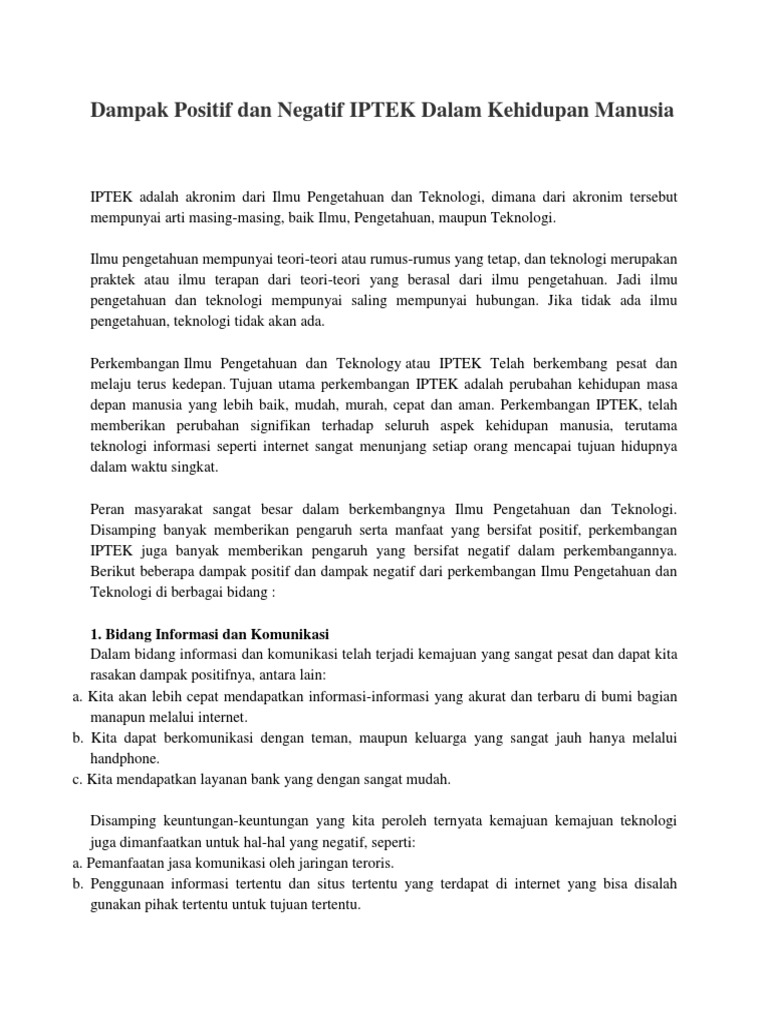 DOC) PENGARUH POSITIF DAN NEGATIF DARI PERKEMBANGAN IPTEK BAGI NEGARA | Sumaya Wulandari - Academia.edu