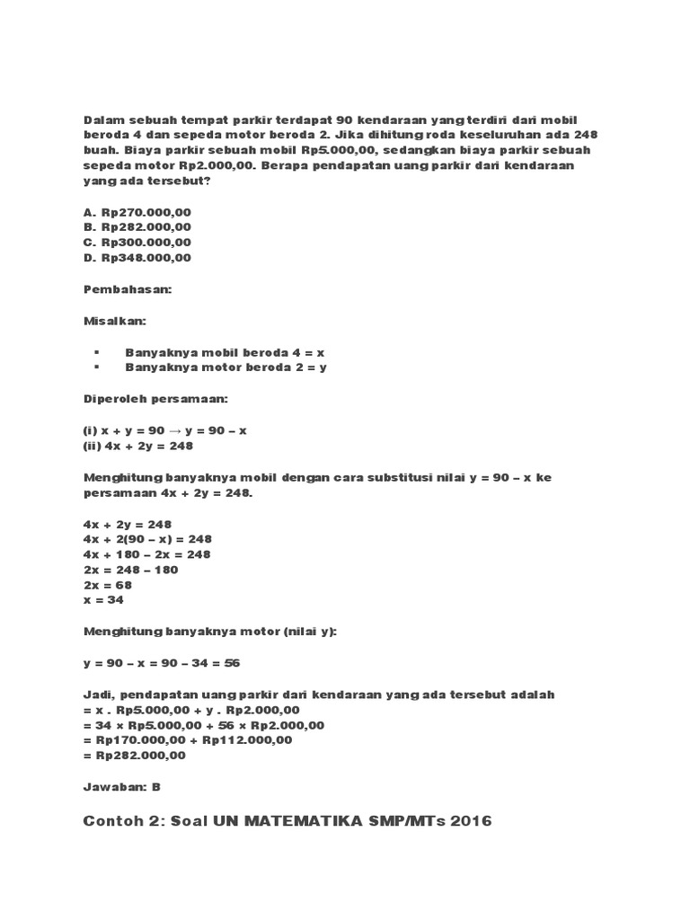 6). Di sebuah tempat parkir terdapat 90 kendaraan terdiri dari mobil dan motor. Jumlah roda dari seluruh kendaraan di tempat parkir