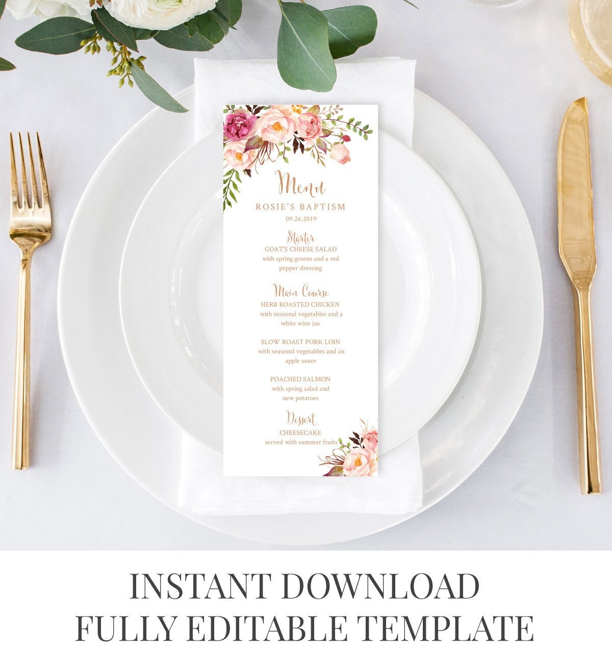 Rose Gold Floral Editable Baptism Menu, Printable Pink Boho …