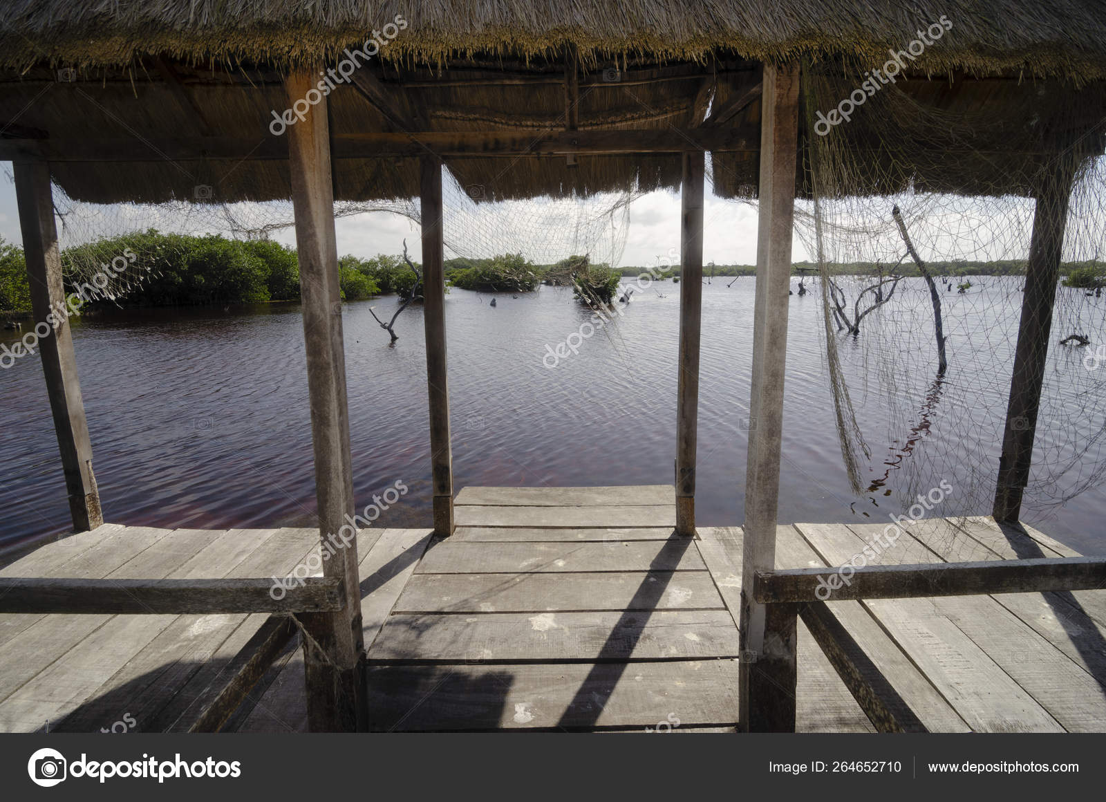 Palapa-pier and view to lagoon with mangrove forest — Stock Photo …