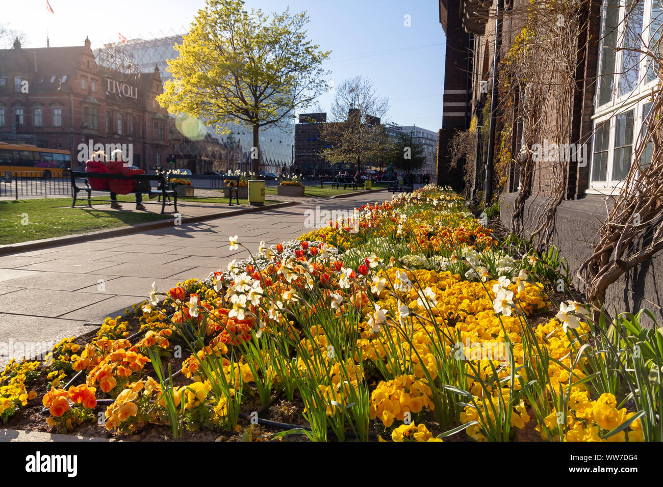 People walking in the street with beautiful flowers in the city of …