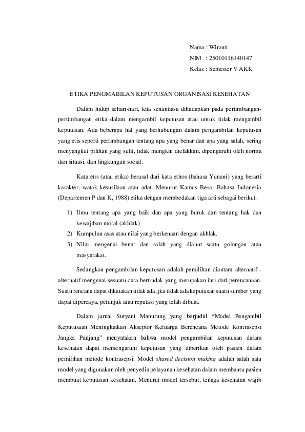 DOC) ETIKA PENGAMABILAN KEPUTUSAN ORGANISASI KESEHATAN | wiranti …