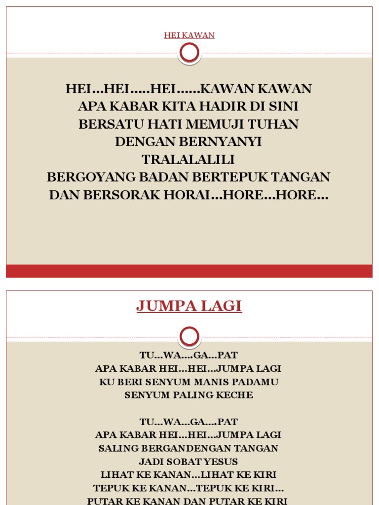 Hei…Hei…..Hei……Kawan Kawan Apa Kabar Kita Hadir Di Sini Bersatu Hati Memuji Tuhan Dengan Bernyanyi Tralalalili Bergoyang Badan Bertepuk Tangan Dan Bersorak Horai…Hore…Hore…