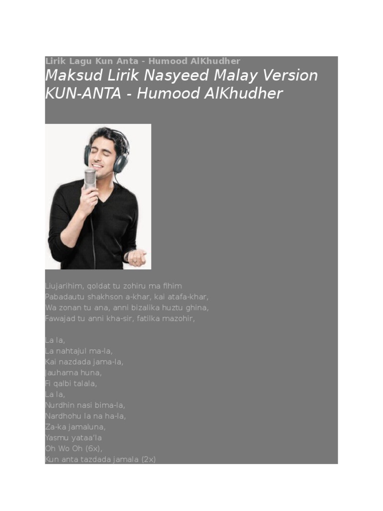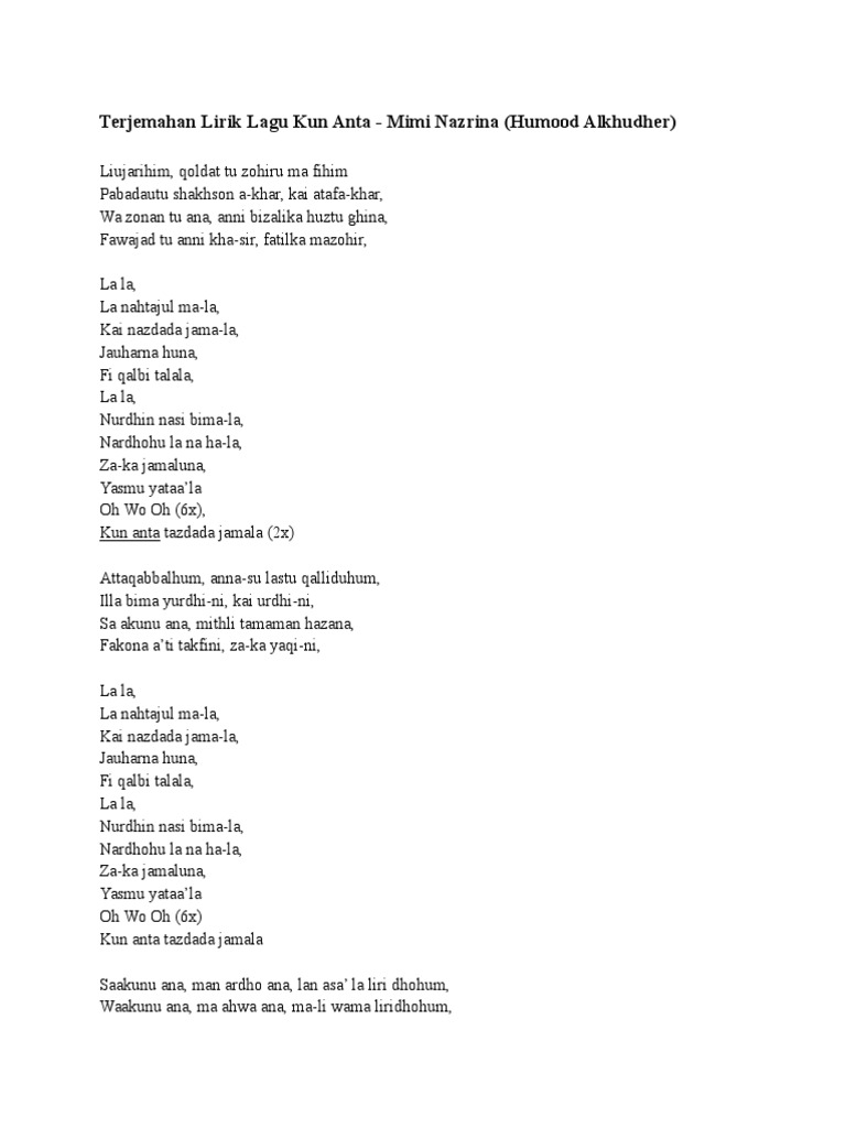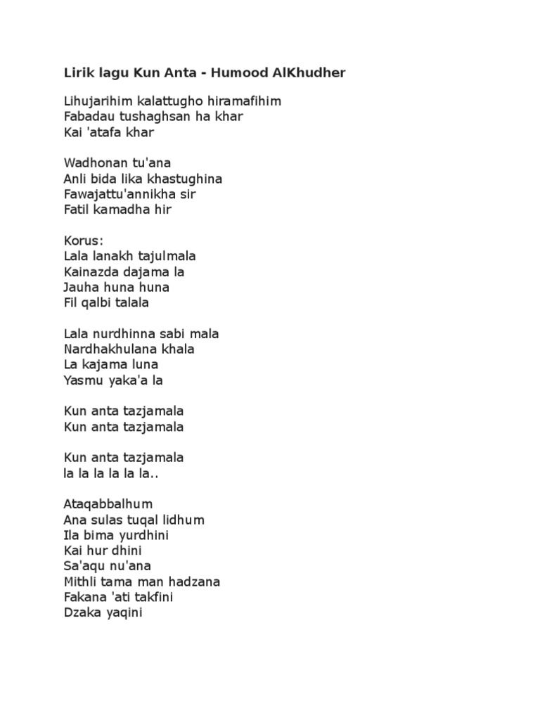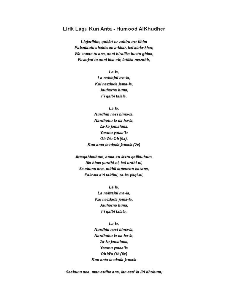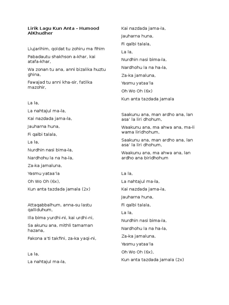 DOC) Lirik Lagu Kun Anta -Humood AlKhudher | Evie Novi - Academia.edu