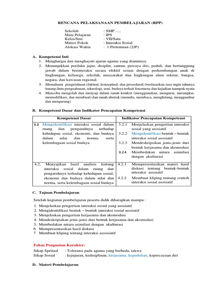 RPP K 13 IPS VII; Bentuk Bentuk Interaksi Sosial (Proses Proses …