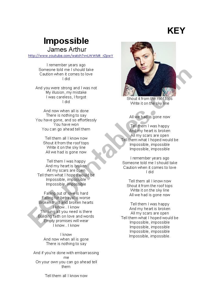 Impossible” by James Arthur - ESL worksheet by Tonguista