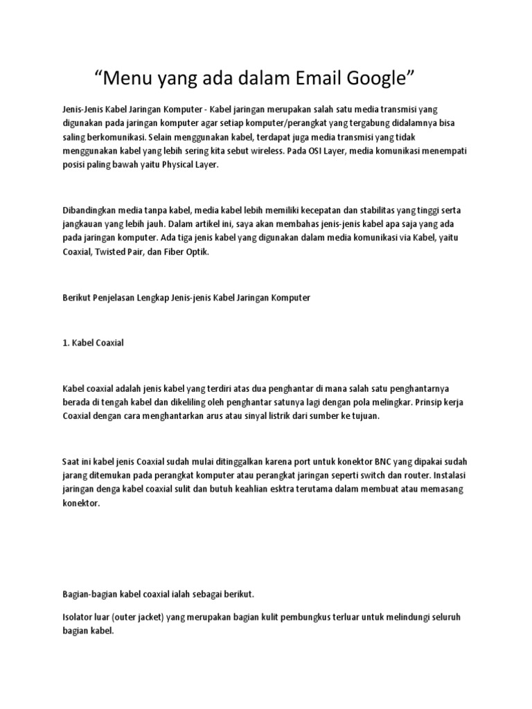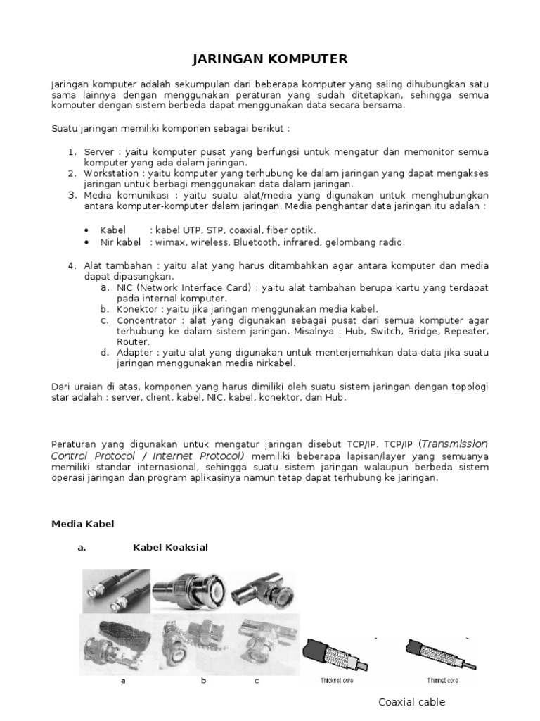 Kabel jaringan Jenis kabel yang biasa digunakan untuk membangun jaringan ada 3 yaitu, Coaxial, Twisted Pair, Fiber Optik. Penjelasan Kabel Coaxial - PDF Free Download