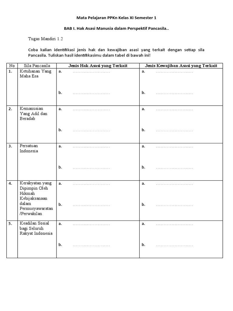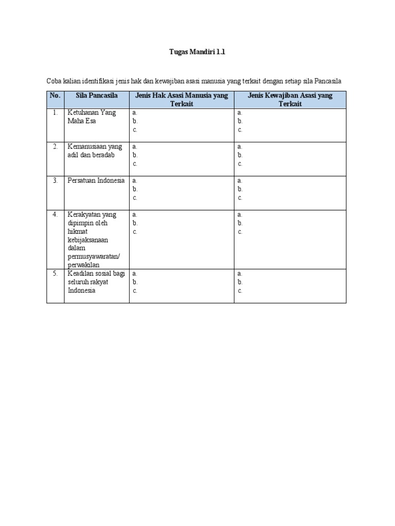 Sila Pancasila, hak asasi yang terkait, dan jenis kewajiban yang terkait…..Tolong bantu jawab - Brainly.co.id