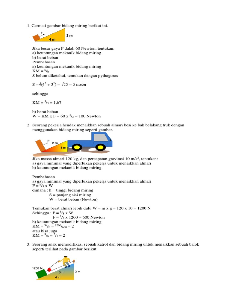 beban berat 5000 N ini dinaikkan segitiga 4 m menggunakan bidang miring yang panjang nya 10 m kuasa - Brainly.co.id
