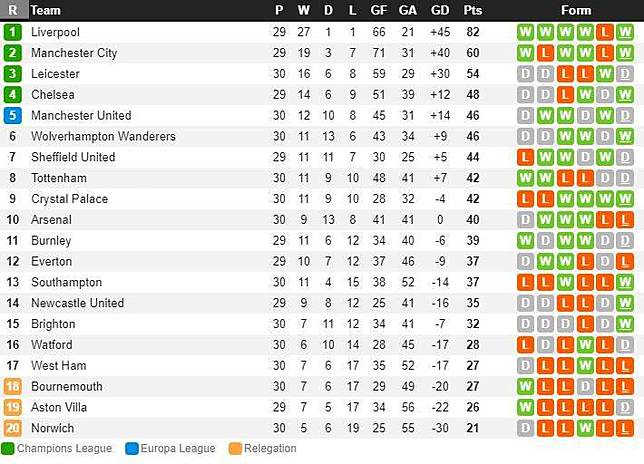 Update Klasemen Liga Inggris Musim 2019-2020 - Gilabola.com