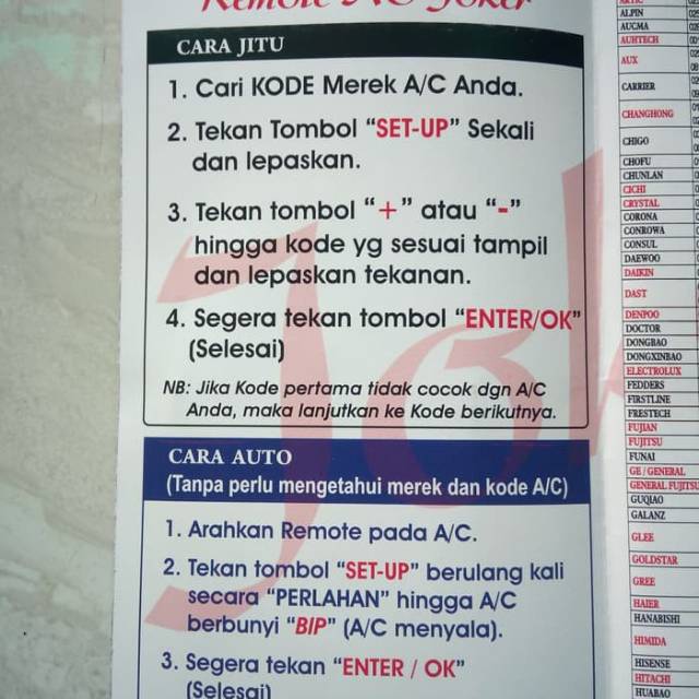 Kode Remot AC Joker Lengkap A sampai Z dan Cara Setting – KODE REMOT