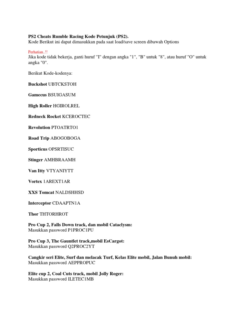 Cheats rumble racing ps2 bahasa indonesia